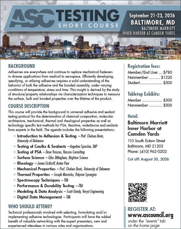 This course will provide the background in universal adhesive and adhesion testing protocol for the determination of chemical composition, molecular architecture, mechanical, thermal and rheological properties as well as technology specific test methods for PSA, Reactive, waterborne and sealants from experts in the field.